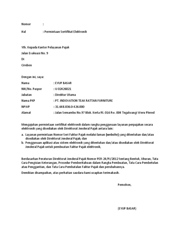 Asli surat pernyataan kesalahan perekaman dari pimpinan bank persepsi/pos persepsi/bank devisa persepsi/bank persepsi mata uang asing tempat pembayaran dalam hal permohonan pemindahbukuan diajukan karena kesalahan perekaman oleh petugas bank persepsi/pos persepsi/bank devisa persepsi/bank persepsi mata uang asing; Sampaikan spt tahunan pph badan beserta bukti penerimaan surat/tanda terima pelaporan spt … Surat pernyataan ini dilengkapi dengan materai. Silakan isi nama pemohon dan jabatan pemohon. Mempunyai spt tahunan atau pph … Memperoleh surat pernyataan berisi persetujuan penggunaan surat elektronik djp dan telah dilengkapi dengan meterai. Sertifikat elektronik (digital certificate) adalah sertifikat yang bersifat elektronik yang memuat tanda tangan elektronik dan identitas yang menunjukan status subjek hukum para pihak dalam transaksi elektronik yang dikeluarkan oleh direktorat jenderal pajak atau penyelenggara sertifikasi elektronik. Layanan perpajakan secara elektronik adalah layanan melalui sistem elektronik yang ditentukan. Notifikasi bisa dilihat pada menu permintaan sertifikat digital. Lampiran formulir nama pemohon lebih dari satu pemohon perorangan / lampiran formulir nama pemohon lebih dari satu pemohon badan hukum. Surat pernyataan pertanggungjawaban keabsahan dan kebenaran data dokumen elektronik Anda akan mendapatkan notifikasi permintaan sertifikat digital sedang dalam proses persetujuan dari kpp. 28.06.2021 · nanti, anda juga akan melihat sejumlah persyaratan dan ketentuan dalam penggunaan sertifikat elektronik.